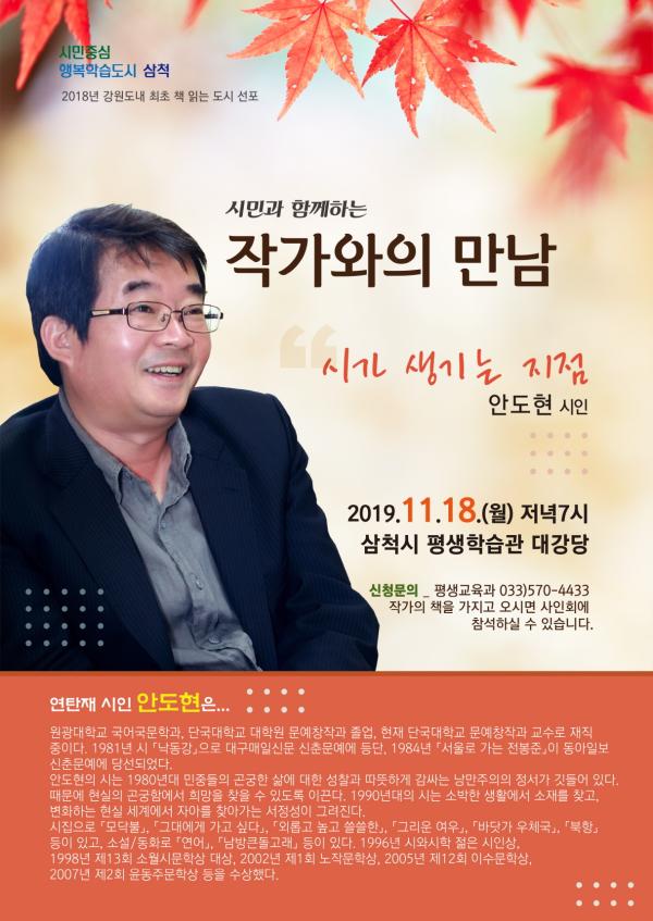 삼척시에서는 오는 11일과 18일 오후 7시 평생학습관 대강당에서 '작가와의 만남'을 운영한다.