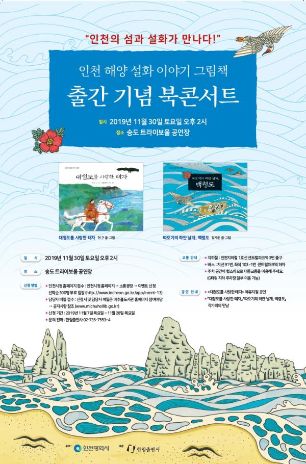 인천광역시는 168개의 섬과 바다가 있는 해양도시로서 주요한 자원인 해양설화를 활용해 허구 글·그림 ‘대청도를 사랑한 태자’와 정지윤 글·그림 ‘따오기의 하얀 날개, 백령도’ 2종의 그림책을 한림출판사와 함께 제작하고 이를 기념해 오는 30일 오후 2시부터 송도 트라이보울에서 북 콘서트를 개최한다고 밝혔다.