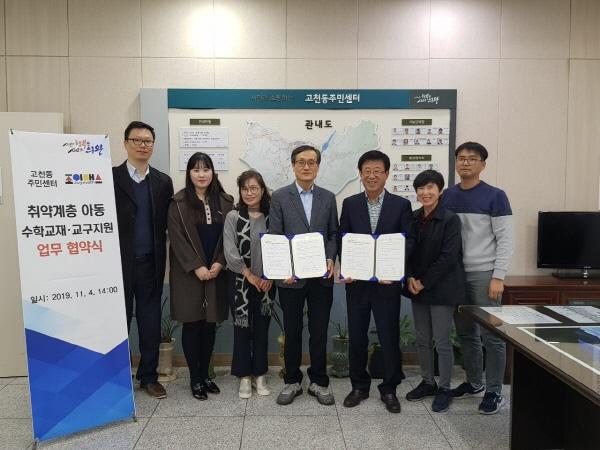 의왕시 고천동은 지난 4일 고천동 주민센터에서 수학교재·교구 기업인 ㈜조이매스와 취약계층 아동을 돕기 위한 교재·교구지원 협약식을 가졌다.