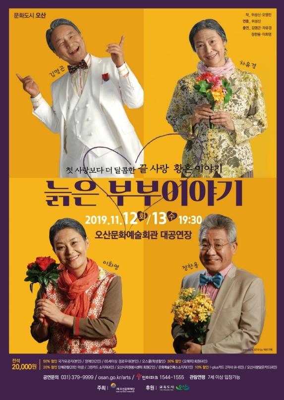 서울 대학로에서 오랜 시간 사랑을 받았던 황혼의 로맨스를 담은 연극 ‘늙은 부부이야기’가 오산문화예술회관 대공연장에서 오는 12일, 13일 오후 7시 30분 이틀간 공연 될 예정이다.
