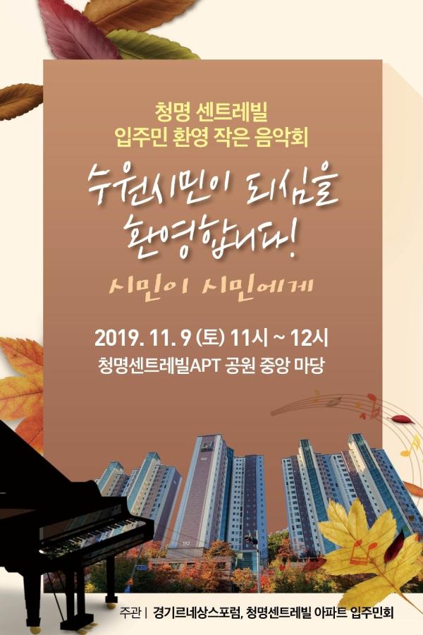 지난 9월 수원시민이 된 청명센트레빌아파트 입주민을 환영하는 작은 음악회가 오는 9일 오전 11시 청명센트레빌아파트 공원 중앙 마당에서 열린다.