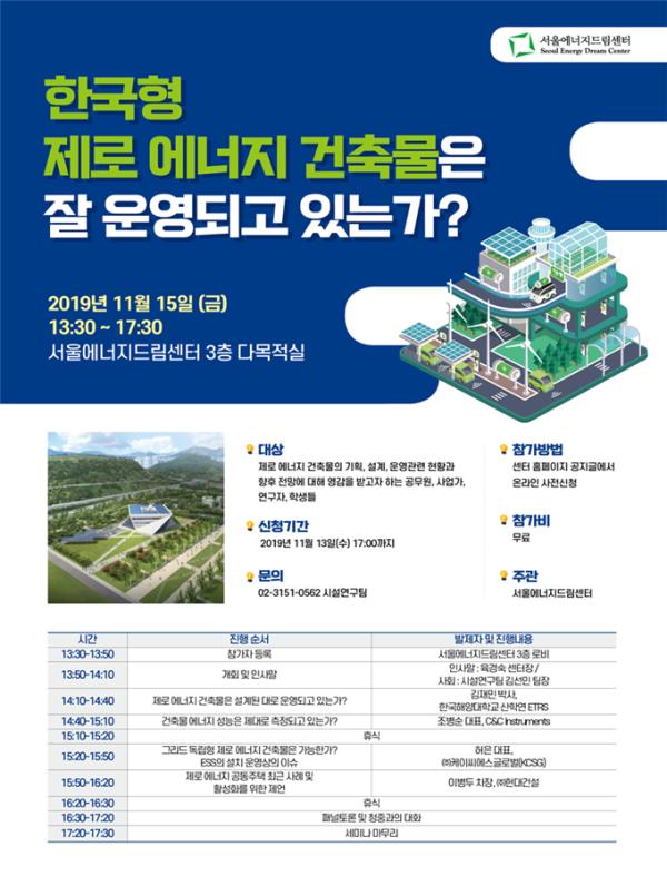 이번 세미나는 제로에너지 건축 보급 확산 방안 및 제로에너지 건물 운영 현황 등에 대한 효과적인 정보 공유를 통해 제로에너지건축 활성화에 기여하고자 마련됐으며 제로에너지 건축 및 관련 기술 분야 전문가들의 경험과 지식을 시민들과 나눌 예정이다.