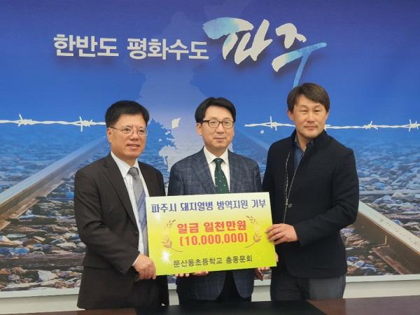 파주시 문산동초등학교 총동문회는 지난 4일 파주시를 방문해 아프리카돼지열병 방역 지원을 위한 1천만원 상당의 돼지열병 소독약을 기부했다.