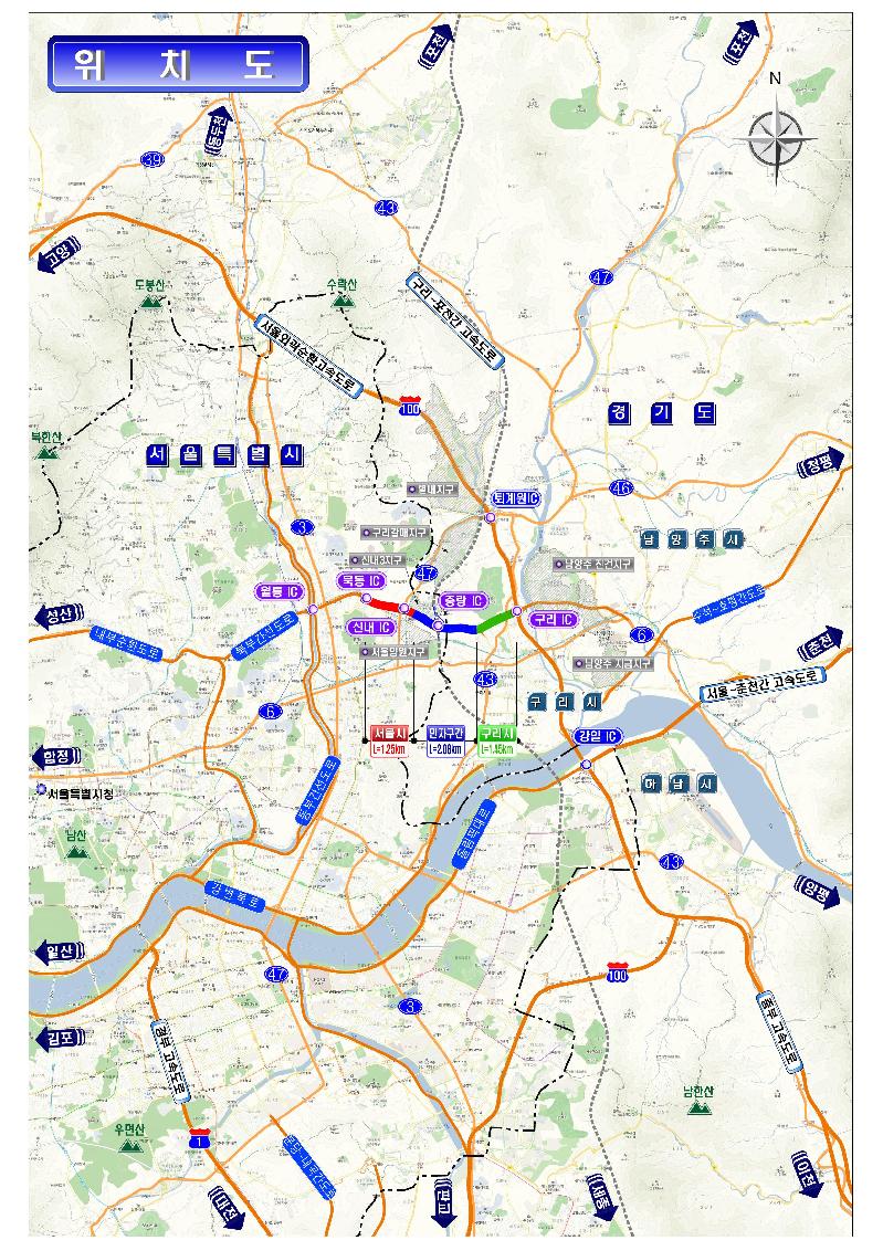 북부간선도로의 구간별 확장방안을 살펴보면 서울시 구간 1.25km는 북부간선도로의 양측으로 1차로씩 확장하고, 구리시 구간 1.45km는 기존의 도로폭 조정 등을 통해 본선 6차로를 확보할 계획이다.
