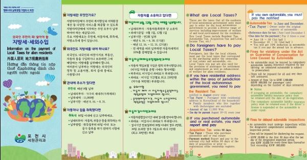 다문화가족 및 외국인이 지방세에 대해 잘 알지 못해 지방세가 체납되고 있으며 과세 규모가 늘어나는 만큼 체납액 규모 또한 꾸준하게 증가하고 있다. 또한 외국인체납은 출국 후 재입국하지 않는 한 징수가 불가능하므로 징수율이 저조하다. 이에 따라 포천시는 체납 발생을 예방하고 외국인 납세자에게 편의를 제공하기 위해 외국어 지방세 및 세외수입 안내 리플릿을 제작했다.