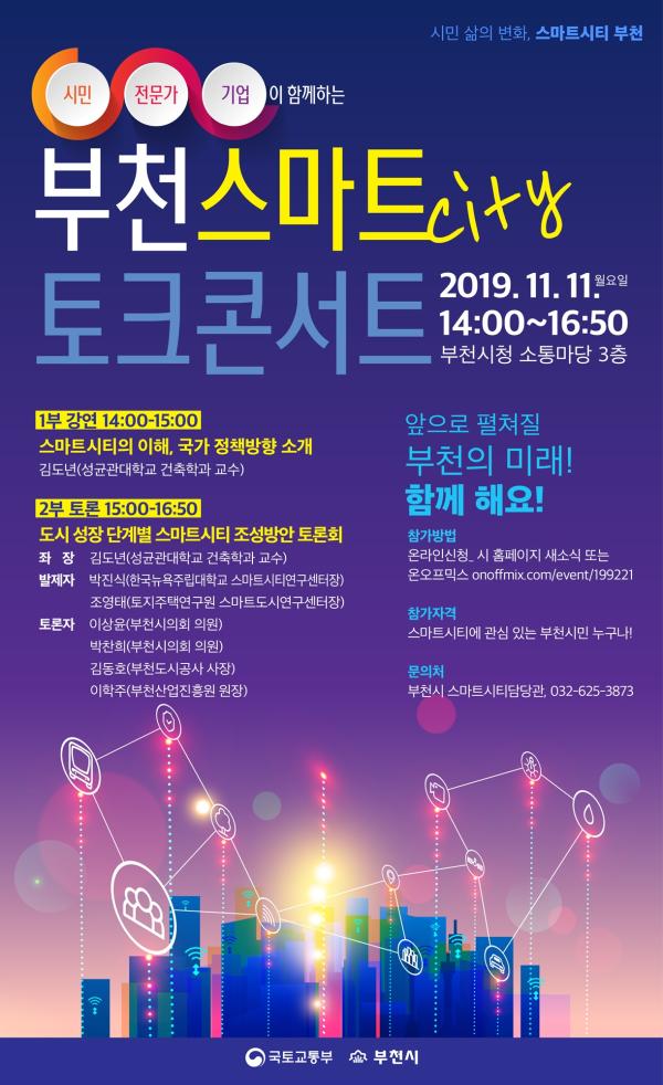 부천시가 오는 11일 오후 2시 부천시청 3층 소통마당에서 ‘스마트시티 토크콘서트’를 개최한다.