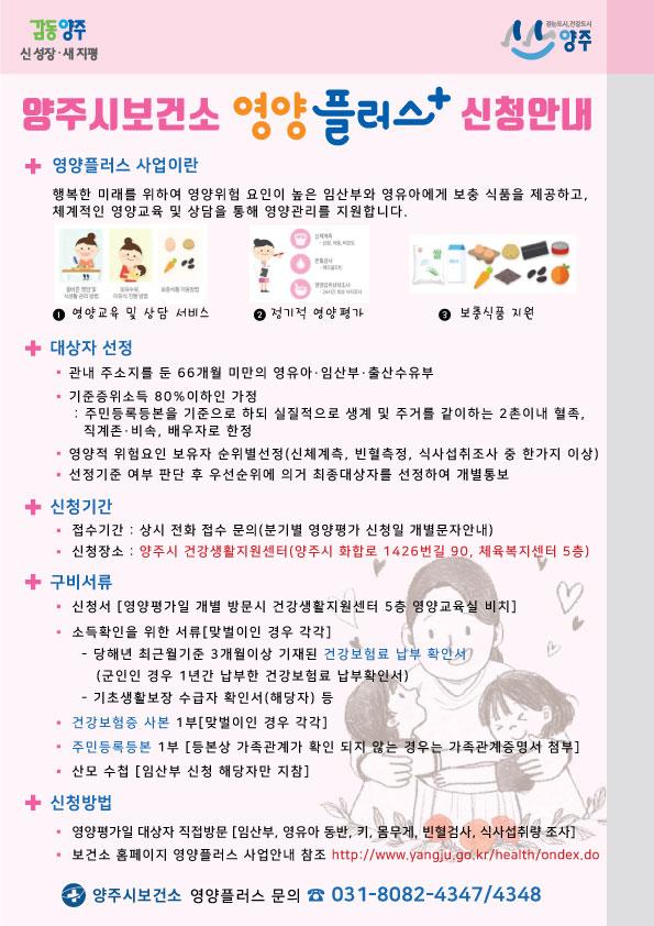 양주시는 임산부와 영유아의 건강관리를 위한 ‘영양플러스 사업’ 대상자를 상시 모집한다고 밝혔다.