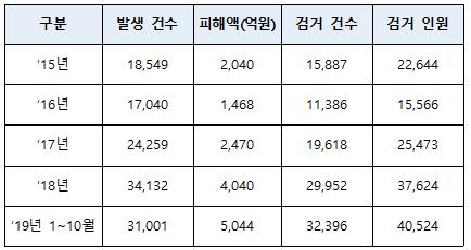 최근 전기통신금융사기 범죄는 2019년 10월까지 3만1001건이 발생하고 피해액이 5044억원에 이르는 등 피해가 계속 증가해 심각한 수준에 이르렀다.