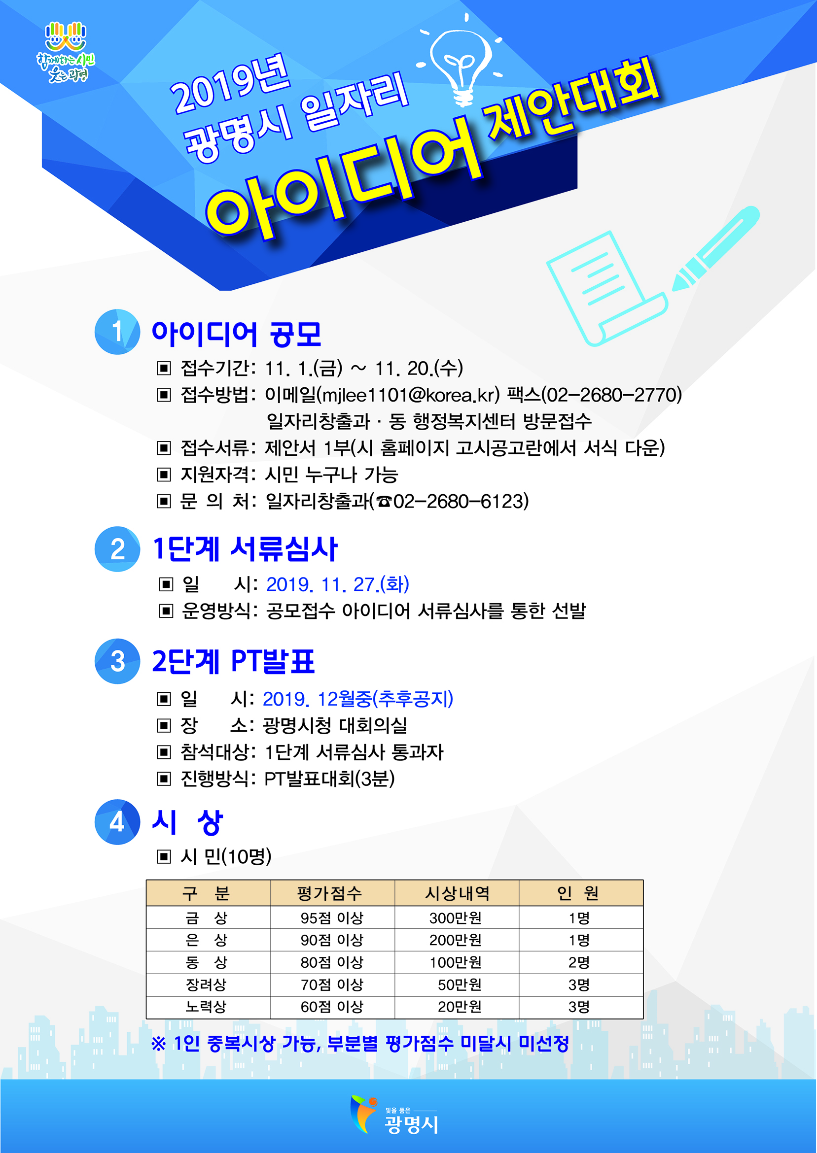 광명시민이면 누구나 참여할 수 있으며 광명시청 누리집 고시공고 ‘2019년 광명시 일자리 아이디어 공모’란에서 제안서 서식을 내려 받아 이메일과 팩스로 접수하면 된다. 일자리창출과, 동 행정복지센터에 방문 접수도 가능하다.