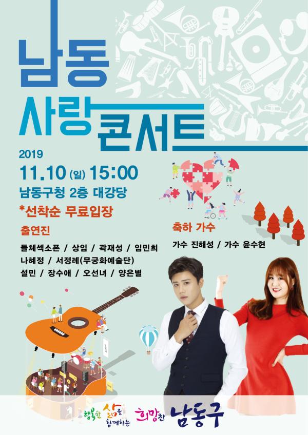 남동구가 오는 10일 일요일 오후 3시에 남동구청 2층 대강당에서 ‘구민과 함께하는 남동사랑 콘서트’를 개최한다.