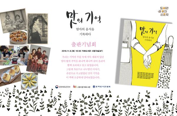 수확하는 계절에 맞춰 출판된 ‘맛의 기억, 엄마의 음식을 기록하다’ 출판기념회는 오는 11월 9일 오전 10시 30분에 가좌도서관 시청각실에서 진행된다. 출판기념회에서는 축하공연과 책 전달식 외에 참여자들이 함께 만든 엄마의 음식도 맛 볼 수 있다.