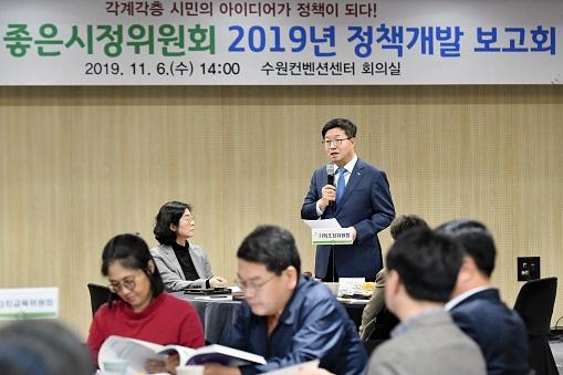 수원시 좋은시정위원회는 6일 수원컨벤션센터 회의실에서 ‘2019년 정책개발 보고회’를 열고 ‘4차산업 시대, 민원경향 분석을 통한 정책개발 모니터링’ 등 7개 정책개발과제를 도입과제로 선정했다.