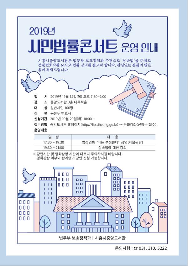 오는 14일 저녁 7시 30분부터 9시까지 시흥시중앙도서관 3층 다목적실에서 시민 100명을 대상으로 법무부 주관 생활 속 법률강좌인 ‘시민법률콘서트’가 열린다.
