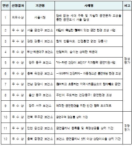 7일 행사에서는 지역사회 금연사업을 우수하게 수행해 금연 문화 확산에 기여한 우수 지방자치단체 12개소를 선정해, 보건복지부 장관상을 수여하고 금연사업 우수사례를 발표한다.