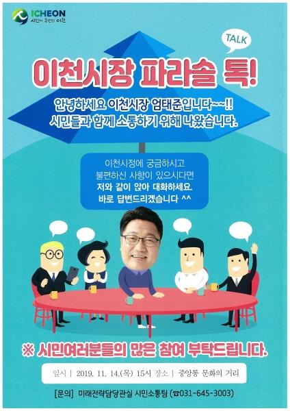 시민과 진정한 소통을 하기 위해 엄태준 시장이 시민들이 많이 찾는 장소에 직접 찾아 나가 자유롭게 대화하고 시민들의 다양한 의견과 생각을 시정에 적극 반영하고자 기획된 ‘이천시장 파라솔 톡~’은 지금까지 중앙통 문화의거리, 이천터미널, 설봉공원등 다양한 장소에서 운영됐다.