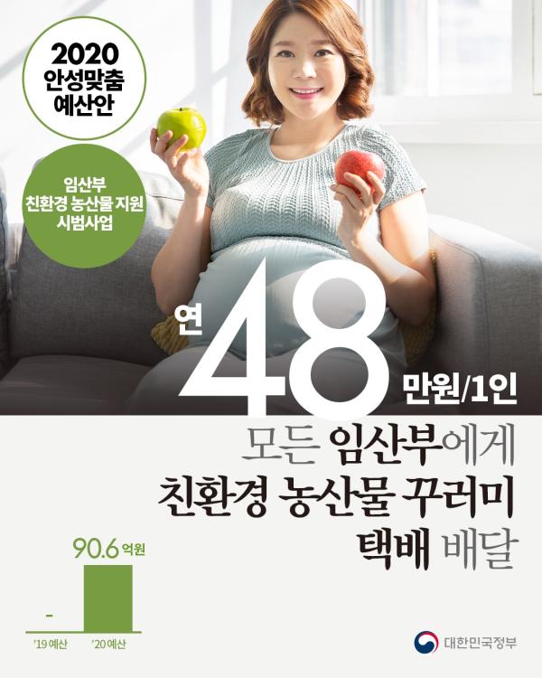 ‘임산부 친환경농산물 꾸러미 지원사업’은 국민참여예산을 통해 선정된 2020년 농림축산식품부 시범사업으로 임산부에게 연간 48만원 한도 내에서 친환경농산물 구매 비용을 지원하는 사업이다.