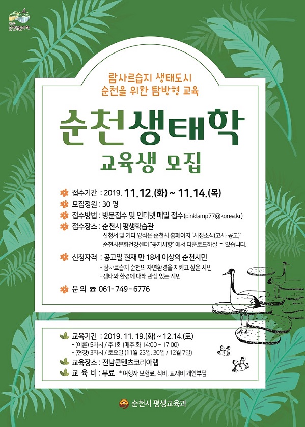 람사르 습지도시 순천의 자연환경을 지키고 싶은 시민, 생태와 환경에 대해 관심 있는 시민(현재 만 18세 이상 60세 이하)이면 누구나 신청 가능하며, 교육생 30명을 선발해 교육을 진행할 예정이다.