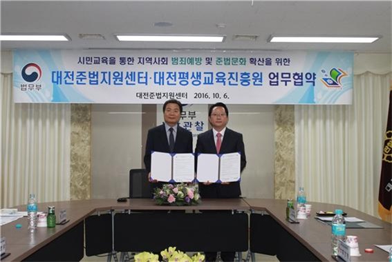 [미디어타임즈= 이광수 기자] 대전평생교육진흥원(원장 송용길)과 대전준법지원센터(센터장 성우제)는 10월 6일(수) 오전 11시 대전준법지원센터 회의실에서 준법문화 확산을 위한 업무협약을 체결했다고 밝혔다.