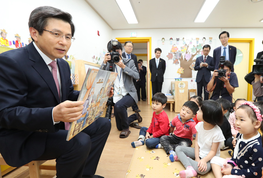 | 황교안 국무총리가 맞춤형 보육현장인 서울 마포구 신석어린이집을 방문, 어린이들에게 전래동화를 읽어주고 있다(사진=국무조정실) |