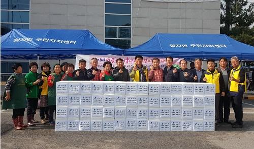주민자치위원회와 지역사회보장협의체, 부녀회, 이장협의회, 발전협의회, 면정자문위원회 회원들과 주민 등 100여명은 이틀에 걸쳐 배추를 수확해 절이고 버무려 170박스의 김치를 담갔다.