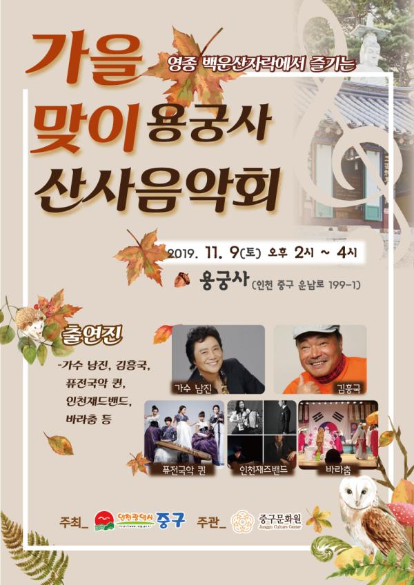 인천 중구가 주최하고 인천 중구 문화원이 주관하는 “가을맞이 용궁사 산사음악회”가 오는 9일 토요일 오후 2시부터 영종국제도시에 위치한 용궁사에서 개최된다.