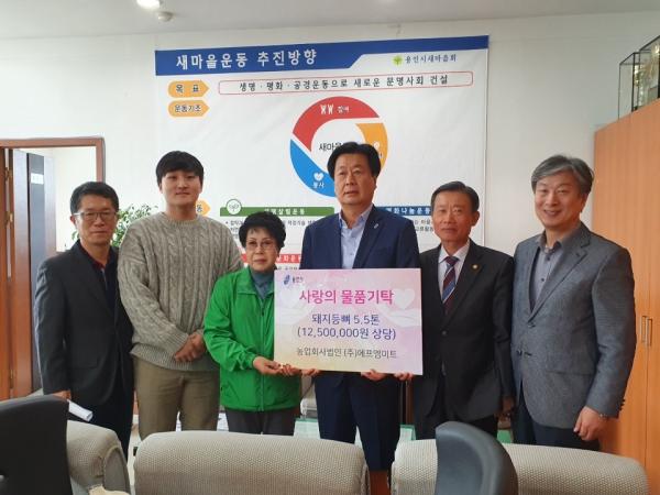 이날 기탁 받은 돼지등뼈는 용인시 새마을회 무료급식소와 관내 경로당 등에 전달할 예정이다.