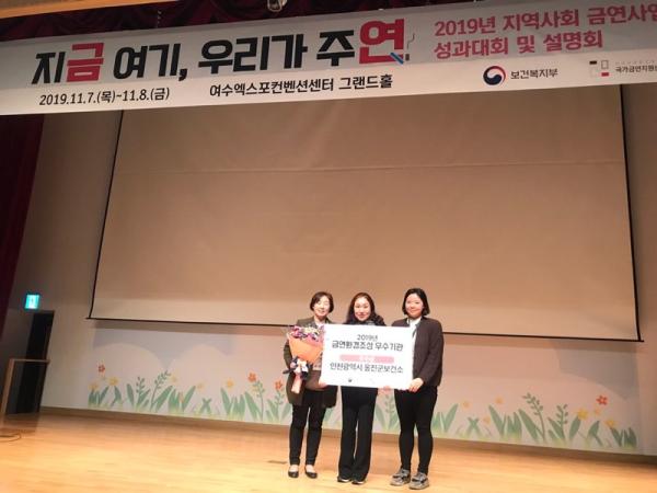 인천시 옹진군이 7일 여수 엑스포컨벤션센터에서 열린 ‘2019년 지역사회 금연사업 성과대회’에서 금연사업으로 주민의 건강증진에 기여한 공을 인정받아 금연환경조성 우수기관으로 선정되어 보건복지부 장관 표창 우수상을 수상했다.