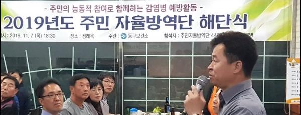 주민 자율방역단은 각 동별 봉사와 사명감이 충만하고 방역 취약지역 및 불결지역 등 지리적 여건에 밝은 주민 자율방역단 11개반 44명로 구성돼 ‘매주 목요일은 동구 일제 방역의 날’로 지정해 하절기인 5월부터 10월까지 주거환경 개선 및 감염병 발생원과 매개체 사전제거를 위한 적극적인 방역활동으로 감염병 예방에 기여했다.