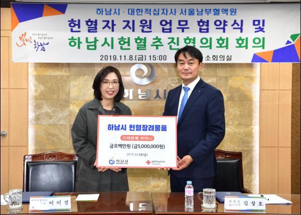 하남시는 8일 오후 3시 하남시청 2층 소회의실에서 안정적 혈액수급 및 헌혈문화 확산을 위한 하남시 헌혈추진협의회 회의를 개최하고 하남시와 대한적십자사 서울남부혈액원과‘헌혈 지원 업무협약’체결하고 헌혈 장려를 위한 지역화폐 500만원 상당을 지원하는 전달식을 진행했다.