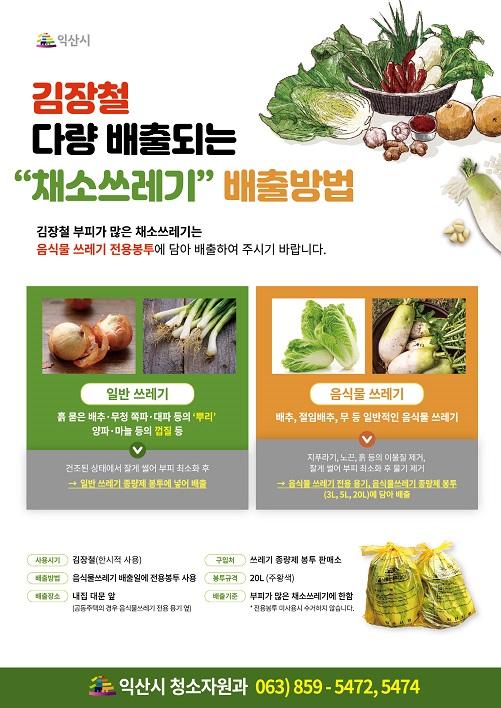 익산시는 본격적인 김장철을 맞아 다량 배출되는 채소쓰레기로 인한 시민 불편을 예방하기 위해 오는 12월 말까지 김장철 채소쓰레기 특별수거기간을 운영한다고 11일 밝혔다.