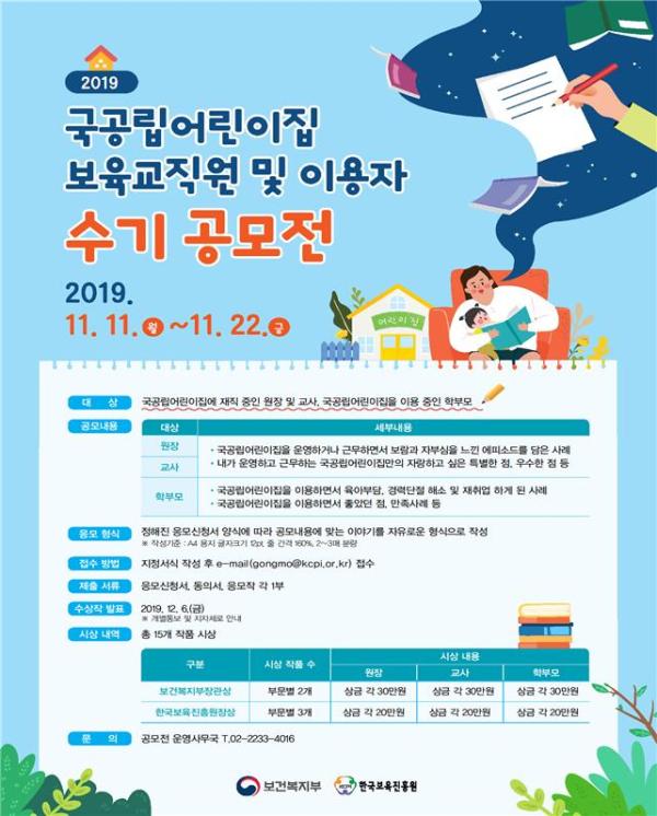아울러 보건복지부는 국공립어린이집 운영과 이용 우수사례를 보육현장에 공유·확산하기 위해 11월 11일부터 22일까지 국공립어린이집 보육교직원, 학부모 대상으로 이용 수기를 공모한다.