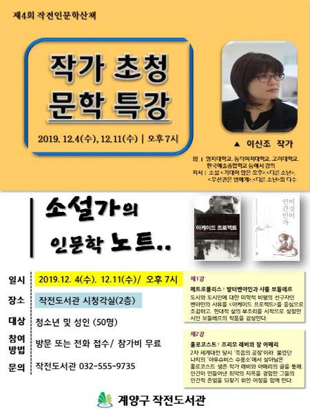 인천 계양구 작전도서관에서 겨울마다 진행하는 작전인문학산책이 올해로 4회를 맞이했다. 이번 강연은 오는 12월 4일과 12월 11일 이신조 작가를 초청해 “소설가의 인문학 노트-메트로폴리스와 홀로코스트”를 주제로 진행될 예정이다.