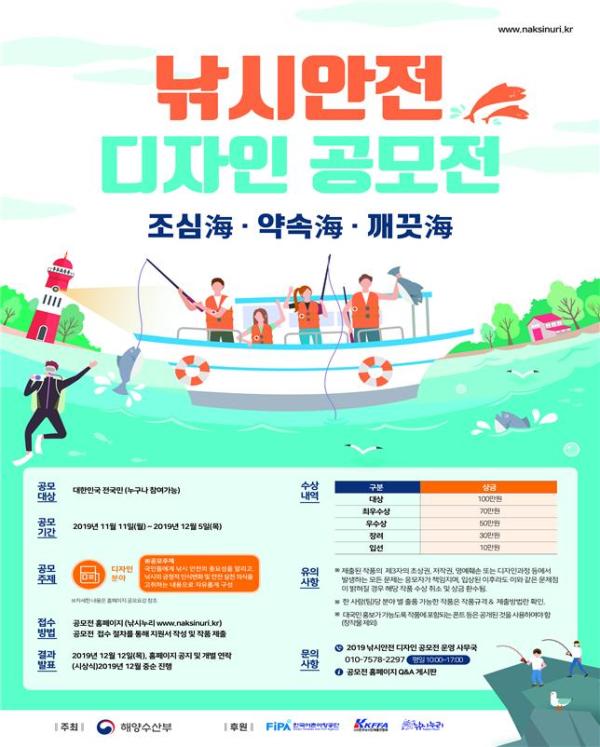 해양수산부는 낚시안전에 대한 국민들의 관심과 의식을 높이기 위해 11일부터 오는 12월 5일까지 ‘2019년 낚시안전 디자인 공모전’을 실시한다.