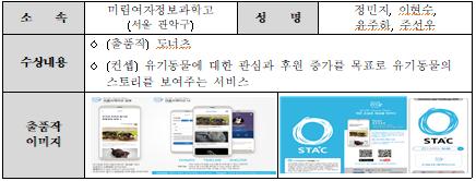 각 부문별 대상은 유기동물에 대한 관심과 후원을 목표로 유기동물의 스토리를 보여주는 앱 ‘도너츠’ 격자에 등장하는 풍선이 가시에 닿기 전에 선을 그려 터트리는 캐주얼 아케이드 게임 ‘Slapit’ 분리수거 요령 및 부가정보를 안내해주는 분리 수거 음성 지원 서비스 ‘SmartCycle’이 수상했다.