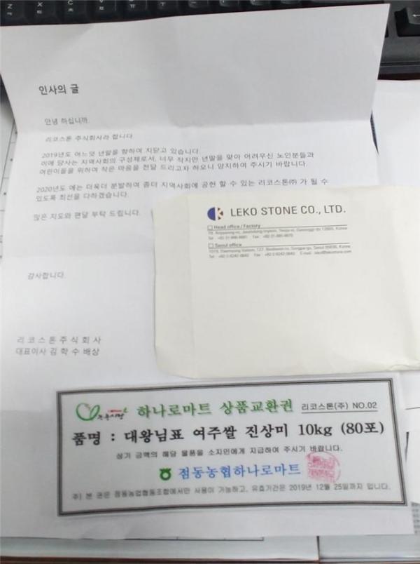 먼저 점동면 장안리 소재 리코스톤에서 연말 맞이 복지 사각지대 저소득 대상자를 위한 쌀 80포를 기탁했다.리코스톤은 인조대리석을 개발하는 회사로 점동면 지역사회 경제 활성화를 비롯 사회 공헌까지 적극적으로 진행해 주는 기업이다.