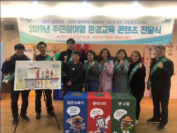 지난 8일 재활용선별장에서 전달식을 가진 재활용 분리수거 교육 콘텐츠는 양주시 추진 시민주도형 혁신 프로젝트 ‘2019 양주 리빙랩 프로젝트’에 참여하고 있는 ‘마을 공동체 네트워크’에서 주택가 쓰레기 문제 개선을 위해 지역별 특성과 연령별 눈높이에 맞춰 제작했다.