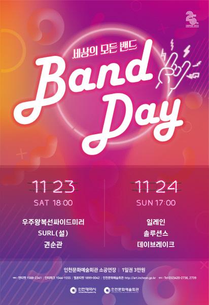 2013년부터 선보인 인천문화예술회관의 브랜드 공연 ‘밴드 데이’는 매력적인 밴드들의 음악을 작은 소공연장에서 가깝게 즐길 수 있는 특별한 무대이다. 세대와 장르를 초월해 자신들만의 확고한 음악세계를 추구하는 밴드들의 음악을 전문공연장에서 최상의 음향과 조명으로 즐기며 잊지 못할 주말의 추억을 만들 수 있다.