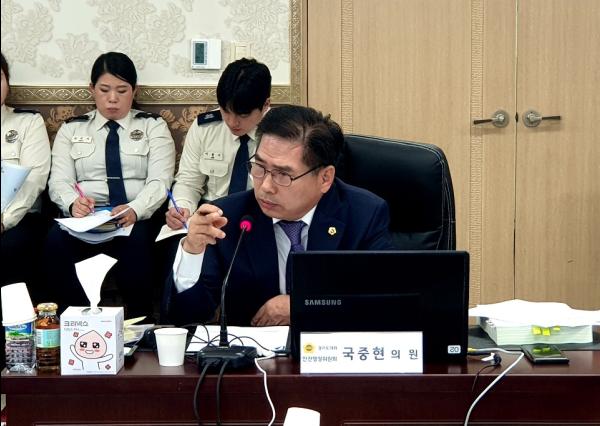 경기도의회 안전행정위원회 국중현 의원이 지난 11일 안양소방서에 대한 2019년 행정사무감사에서 의용소방대원의 다양한 활동 여건 마련을 위한 소방서의 협력을 당부했다.