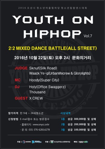 ‘Youth On HipHop’은 청소년어울림마당 중 7개의 분야중 마지막 힙합댄스대회이며 춤을 소재로 청소년들이 자신의 개성을 창의적이고 자유롭게 표현할 수 있는 장을 형성하고 지역주민과 청소년들의 문화감수성 향상을 위하여 32명의 참가자를 선착순 모집하여 2:2 MIXED DANCE BATTLE 로 진행된다.