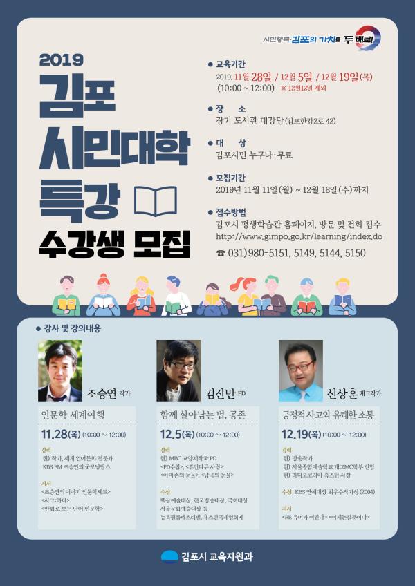 김포시는 누구나 쉽게 접할 수 있는 교육 기회 제공을 통해 시민의 자기개발에 기여하고 평생교육 참여를 촉진하기 위해 ‘2019 하반기 김포 시민대학 특강’ 수강생을 모집한다.