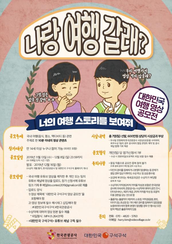 한국관광공사는 참신한 국내여행 영상 발굴을 위해 ‘대한민국 여행 영상’ 공모전을 13일부터 오는 12월 8일까지 실시한다.