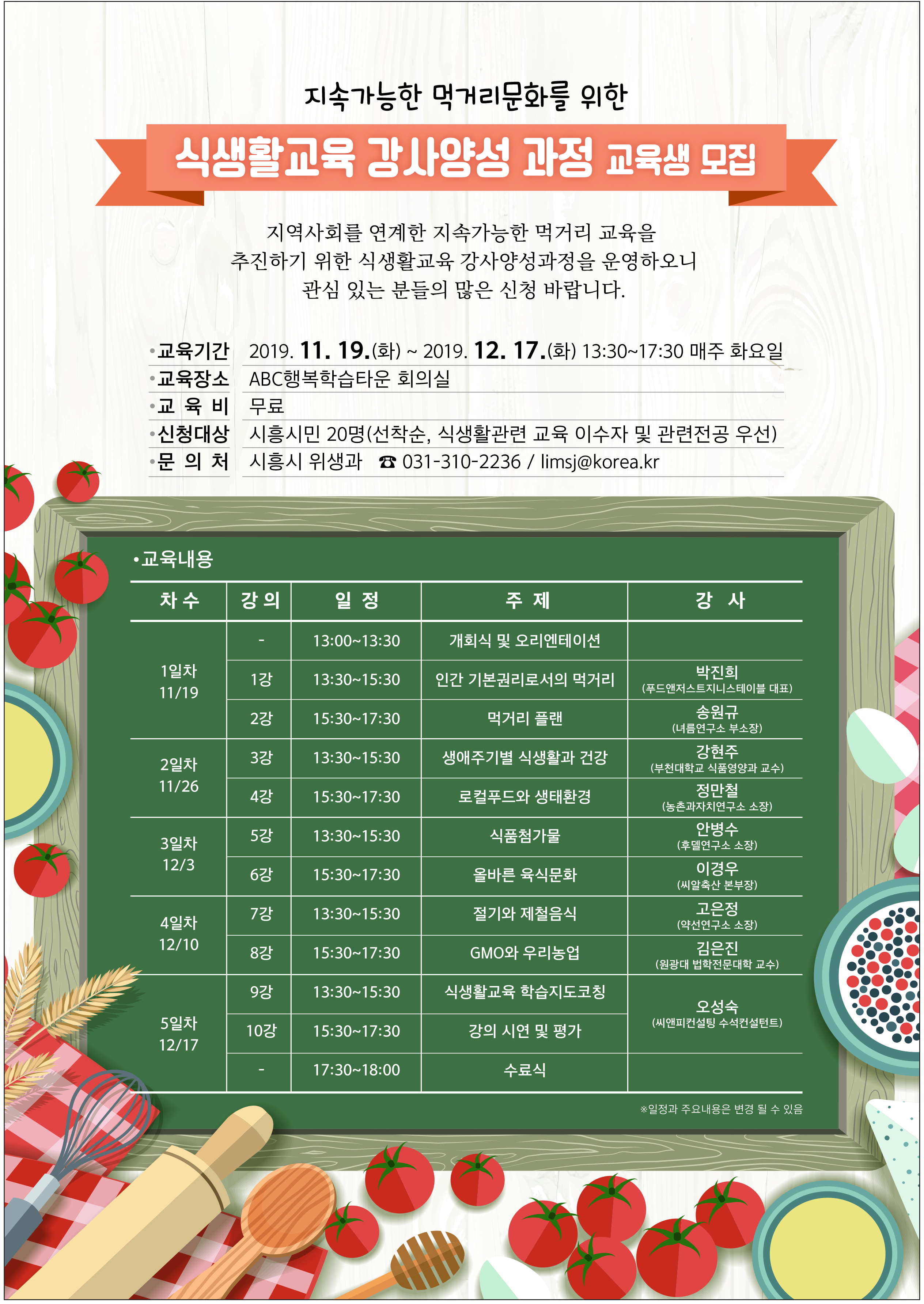 시흥시는 지역사회 연계로 지속가능한 식생활 교육을 추진하기 위해 ‘식생활교육 강사양성과정’ 교육생을 모집하고 있다.
