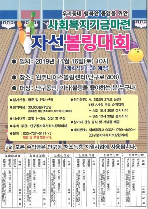 단구동 지역사회보장협의체는 저소득층 지원을 위한 사회복지기금 마련 자선 볼링대회를 오는 16일 오전 10시 원주나이스볼링센터에서 개최한다.