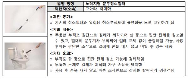 ‘부문1’의 시제품 26건은 11월 20일까지 사전 진행되는 네티즌 투표와 11월 22일 진행되는 전문가 현장심사 점수를 합산해 공개평가를 받는다. 최고점을 받은 제안자에게는 대통령상과 발명장려금 1천만원이 주어지고 국회의장상과 국무총리상 수상자에게는 각각 발명장려금 2백만원이 수여되는 등 생활 속 여성 아이디어의 ‘최고’를 가린다.