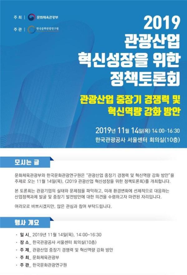 문화체육관광부는 한국문화관광연구원과 함께 오는 14일 오후 2시 한국관광공사 서울센터 10층에서 ‘관광산업 혁신성장을 위한 정책토론회’를 개최한다.