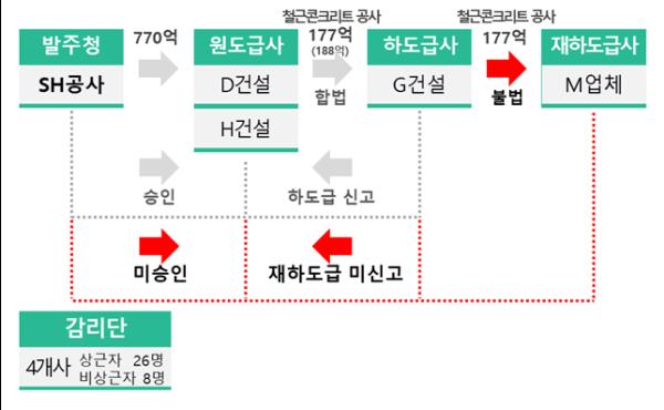서울시의회 김종무 의원은 2019년도 서울주택도시공사 행정사무감사에서 “177억원 상당의 철근콘크리트 공사를 불법 재하도급 받은 M업체 대표가 원도급사인 H건설 직원에게 ‘감리단장 및 SH 감리단장에게 전달’할 명목으로 1억 7,600만원 상당의 금품과 향응을 32차례에 걸쳐 제공했다는 민원을 지난 8월경 제기했고 SH공사가 자체조사에 착수해 불법하도급 및 금품수수 혐의에 대해 해당 업체 및 관계자들을 경찰에 고발”한 사실이 있음을 밝혔다.