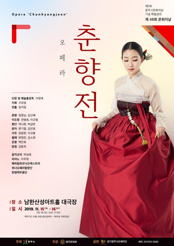 ‘춘향전’은 우리 고전문학의 대표작을 오페라로 재탄생시킨 작품으로 모든 연령대에 친근한 우리 내의 사랑 이야기이며 눈과 귀를 사로잡을 음악과 무대 예술로 새로운 매력과 재미를 줄 것으로 기대된다.