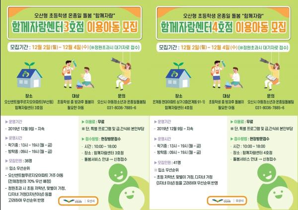 오산시는 이에 따라 이들 시설을 이용할 아동을 12월 2일부터 4일까지 모집한다. 오산시에 거주하는 초등학생 중 돌봄이 필요한 아동은 소득에 상관없이 누구나 신청이 가능하며 정원 초과 시 저학년, 맞벌이가정, 다자녀가정의 아동 등 돌봄 우선순위를 적용해 선정된다.