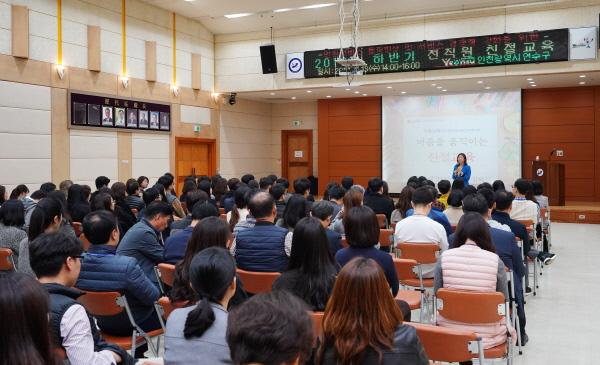 구민에게 마음으로 다가가는 친절행정을 구현하기 위한 이번 교육은 김혜원 브릿지엔교육연구소 대표를 초빙해 친절한 민원응대의 기초가 되는 공감과 소통 역량 강화, 악성민원 응대 요령, 행복한 나로부터 시작되는 행복한 응대를 위한 스트레스 관리 요령 등의 주제로 진행되어 직원들의 큰 호응을 얻었다.
