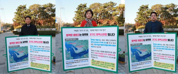1인 시위에 참여한 의원들은 “평택항 신생 매립지는 평택시에서 모든 기반시설과 행정지원을 제공하는 등 어느 누가 봐도 당연히 경기도 평택시 관할”이라며, “의회는 50만 평택시민들을 대표해 헌법재판소와 대법원이 법률에 근거해 합리적이고 공정한 판결을 내려 줄 것을 강력히 촉구 한다”고 말했다.